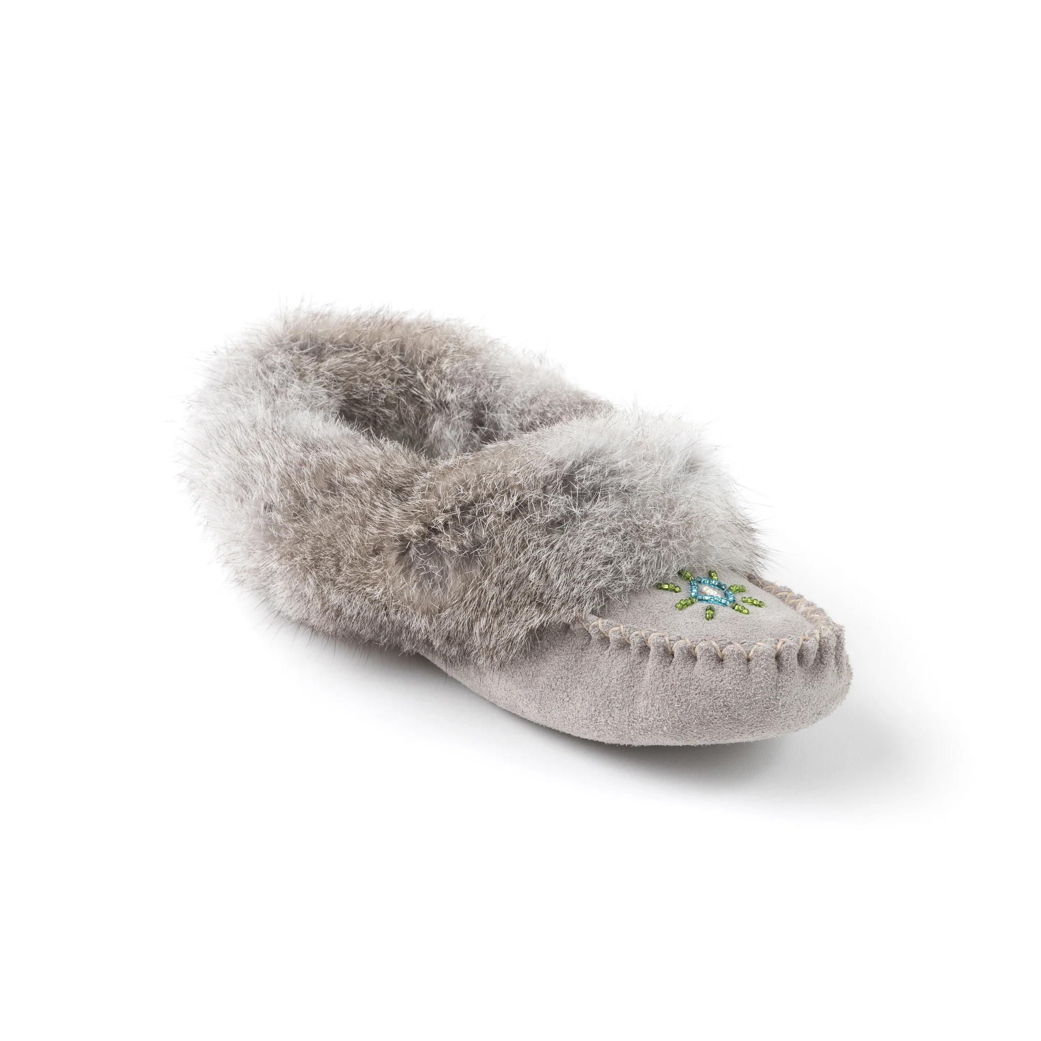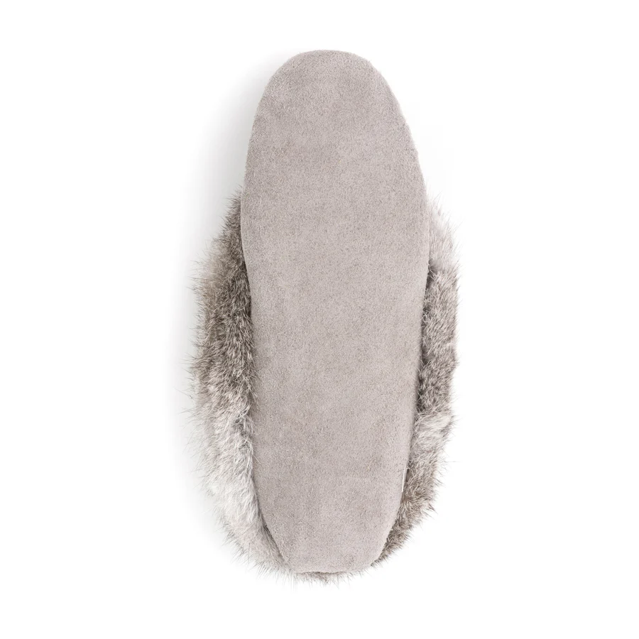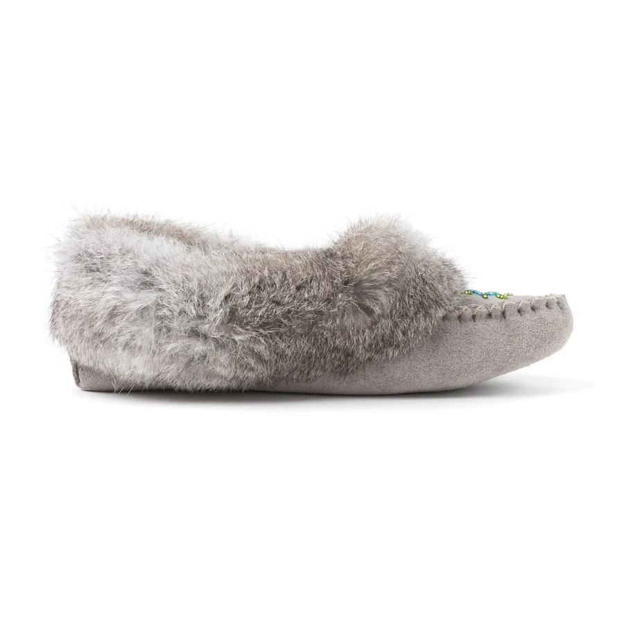 Le mocassin TÄNIONNIENHA’ allie élégance et confort absolu. Confectionné en suède américain et orné de fourrure de lapin, il garde vos pieds bien au chaud tout en apportant une touche chic et raffinée à vos moments de détente. Ses perles cousues à la main font de chaque paire une création unique, inspirée par le savoir-faire artisanal autochtone.